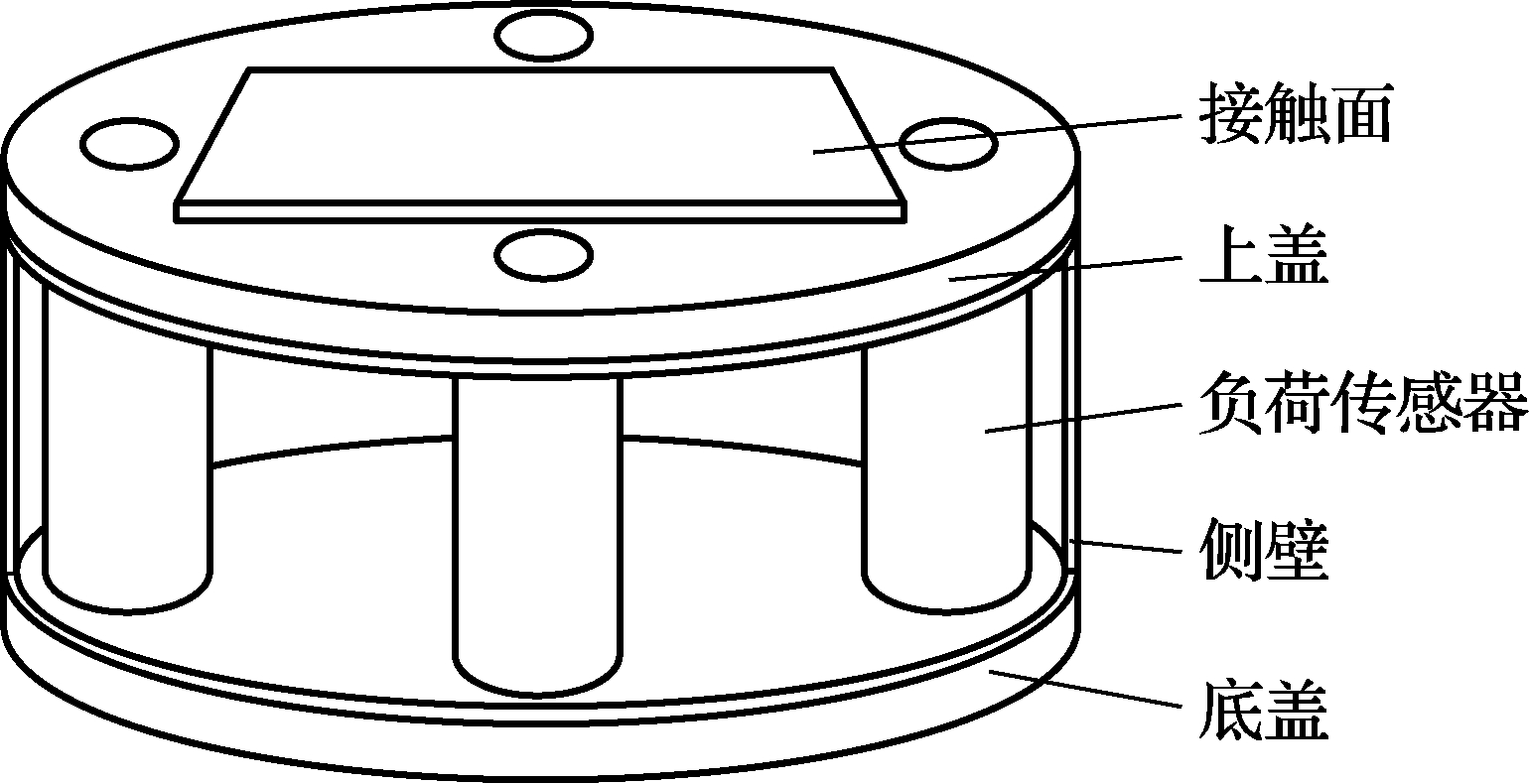 具体方案是,设计一个由四个负荷传感器组成的传感器组,如图1所示。四个传感器围绕几何中心对称分布在x轴和y轴上,上下以盖板固定,上盖板凸出一个和试块底面相同的接触平台用于模拟试块。测量时放置于试验机的指定位置(传感器组的几何中心)。