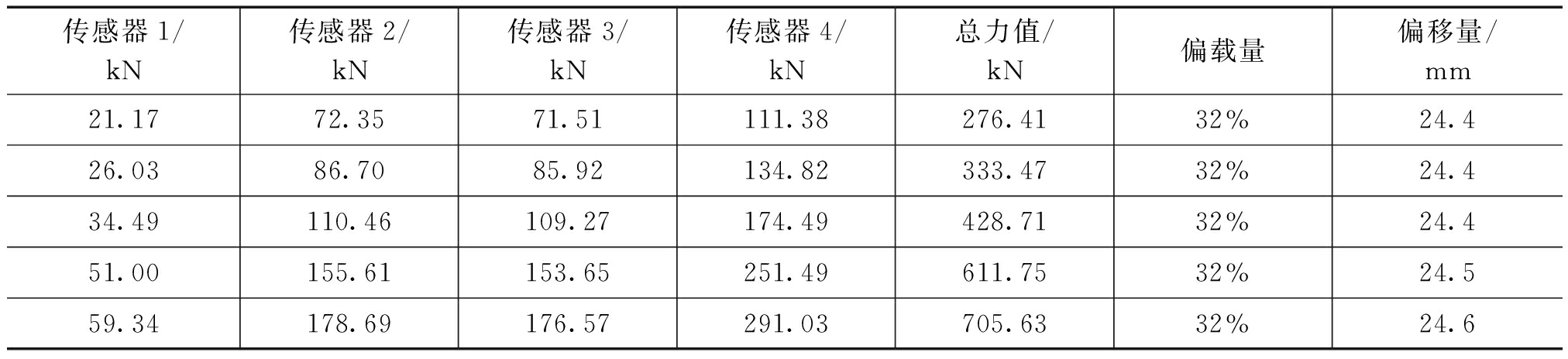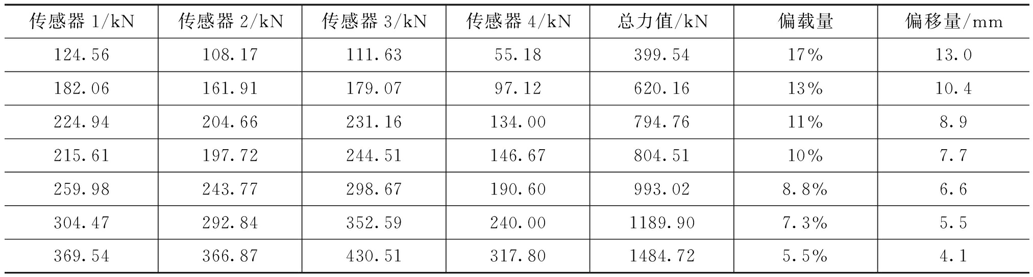 从试验的结果来看,表1试验结果和目测结果略有差距,分析可能是因为现场标定时带入了误差。表2中第一组的传感器2和传感器3的受力和大于传感器1和传感器4的受力和,说明传感器2和传感器3的高度略大。但是两次试验偏移量的计算结果一致性很好,相当理想。