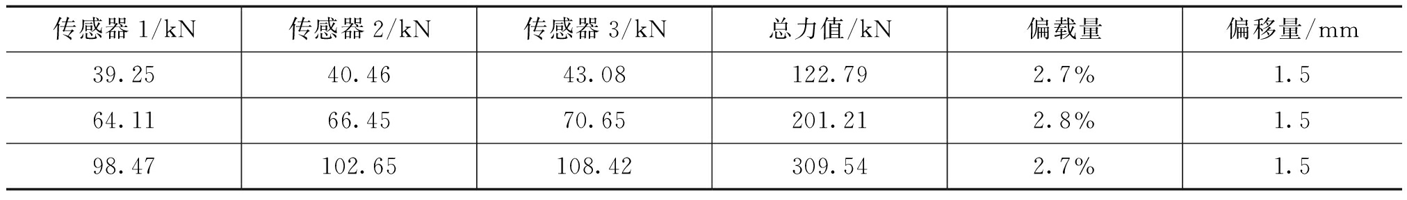 从试验的结果来看,表1试验结果和目测结果略有差距,分析可能是因为现场标定时带入了误差。表2中第一组的传感器2和传感器3的受力和大于传感器1和传感器4的受力和,说明传感器2和传感器3的高度略大。但是两次试验偏移量的计算结果一致性很好,相当理想。